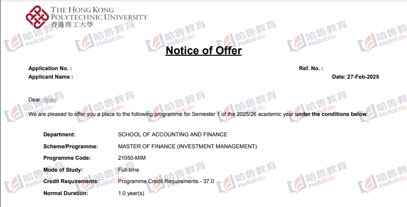 【哈鲁2025录取】继城大后,广金学子再获港理工金融学硕士offer!