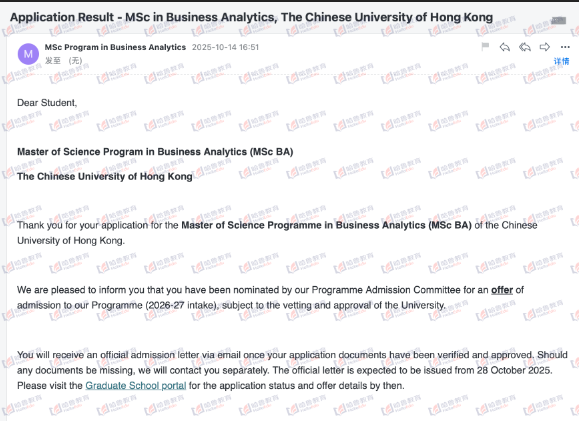 【哈鲁2026录取】继港科大后,GPA3.3+再获港中文商业分析硕士offer!