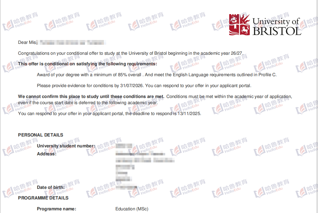【哈鲁2026录取】布里斯托大学教育学硕士offer到!