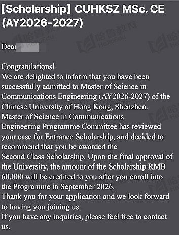 【哈鲁2026录取】厉害!港中深通信工程硕士含6万奖学金录取到!