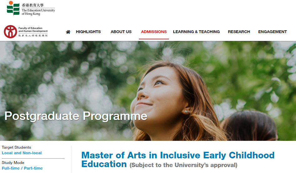 该课程开设在教育及人类发展学院下,全日制项目时长1年。该项目关注全球包容性教育趋势和政策发展,为毕业生准备领导从出生到八岁儿童的包容性实践,涵盖早期儿童和小学早期教育,这是该课程在该地区具有独特性。该项目为学生提供所需的专业知识和实践技能,以支持具有特殊需求、非中文背景和其他不同需求的幼儿,使他们能够设计和实施创新的课程和教学法,以促进参与、包容和平等。该课程为学生提供所需的专业知识和实践技能,以支持具有特殊需求、非中文背景和其他不同需求的幼儿,使他们能够设计和实施创新的课程和教学法,以促进参与、包容和平等。