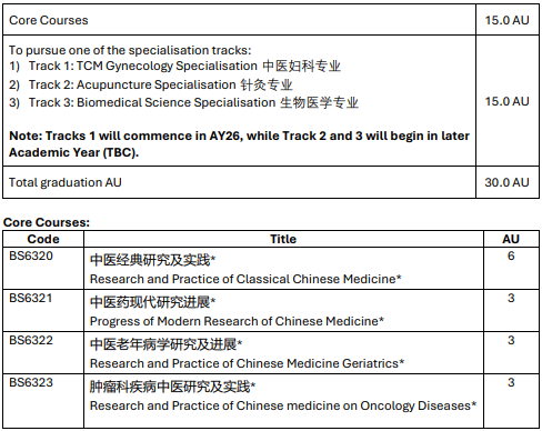 或获得新加坡医学委员会认可的医学学士学位,或获得联合健康专业委员会(新加坡)认可的联合健康学科学士学位(例如,药学、护理、物理治疗、职业治疗、放射诊断/放射治疗、言语治疗、营养学、医学实验室科学)或同等学历,具有足够的中文(普通话)水平,能够阅读经典和现代中医文献,并能够用中文(普通话)交流