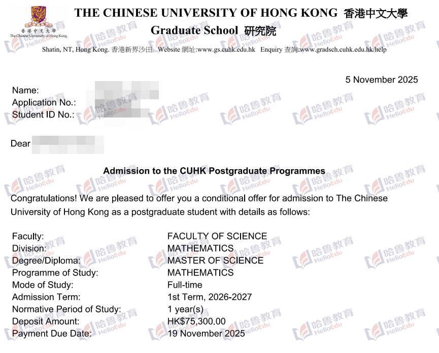 【哈鲁2026录取】港中文offer+1!雅思6.5拿下数学硕士录取!