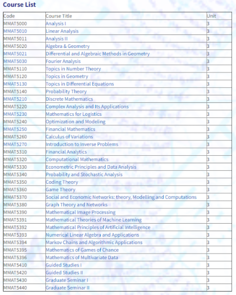 香港中文大学的数学硕士学位包括数学基础研究生课程,也提供了在感兴趣的领域进行一些更专业培训的机会。典型的硕士课程将涉及以下领域:代数,分析,几何,基础,数值分析,计算机科学,以及其他各种应用数学领域。