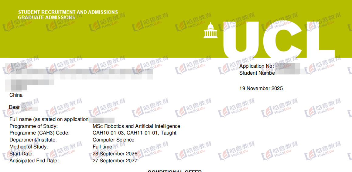 【哈鲁2026录取】厉害了!GPA85+获伦敦大学学院机器人与人工智能硕士offer!