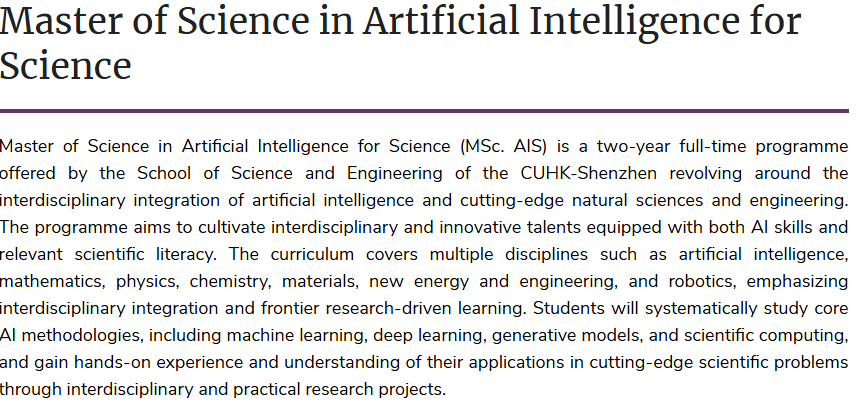 同学请注意!香港中文大学(深圳)理学院官宣2026秋增设火热项目——人工智能(科学应用)理学硕士(Master of Science in Artificial Intelligence for Science),并将于12月1日开放26fall申请,感兴趣的同学,赶紧冲啊~