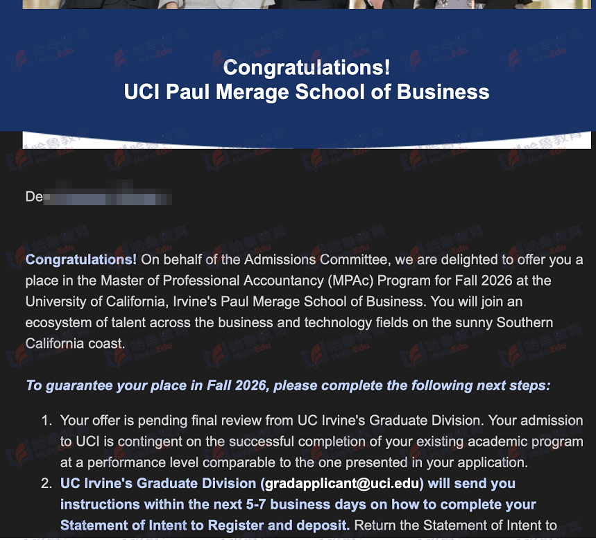 【哈鲁2026录取】加州大学欧文分校专业会计硕士offer到!
