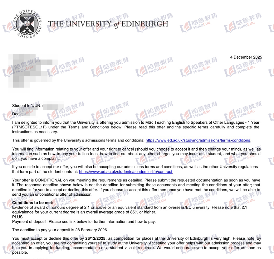 【哈鲁2026录取】双非背景获爱丁堡大学TESOL硕士录取!