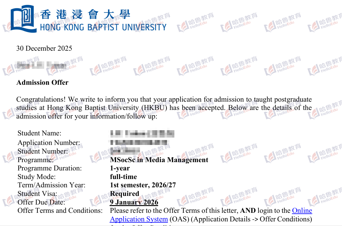 【哈鲁2026录取】GPA85+获香港浸会大学媒体管理硕士offer!