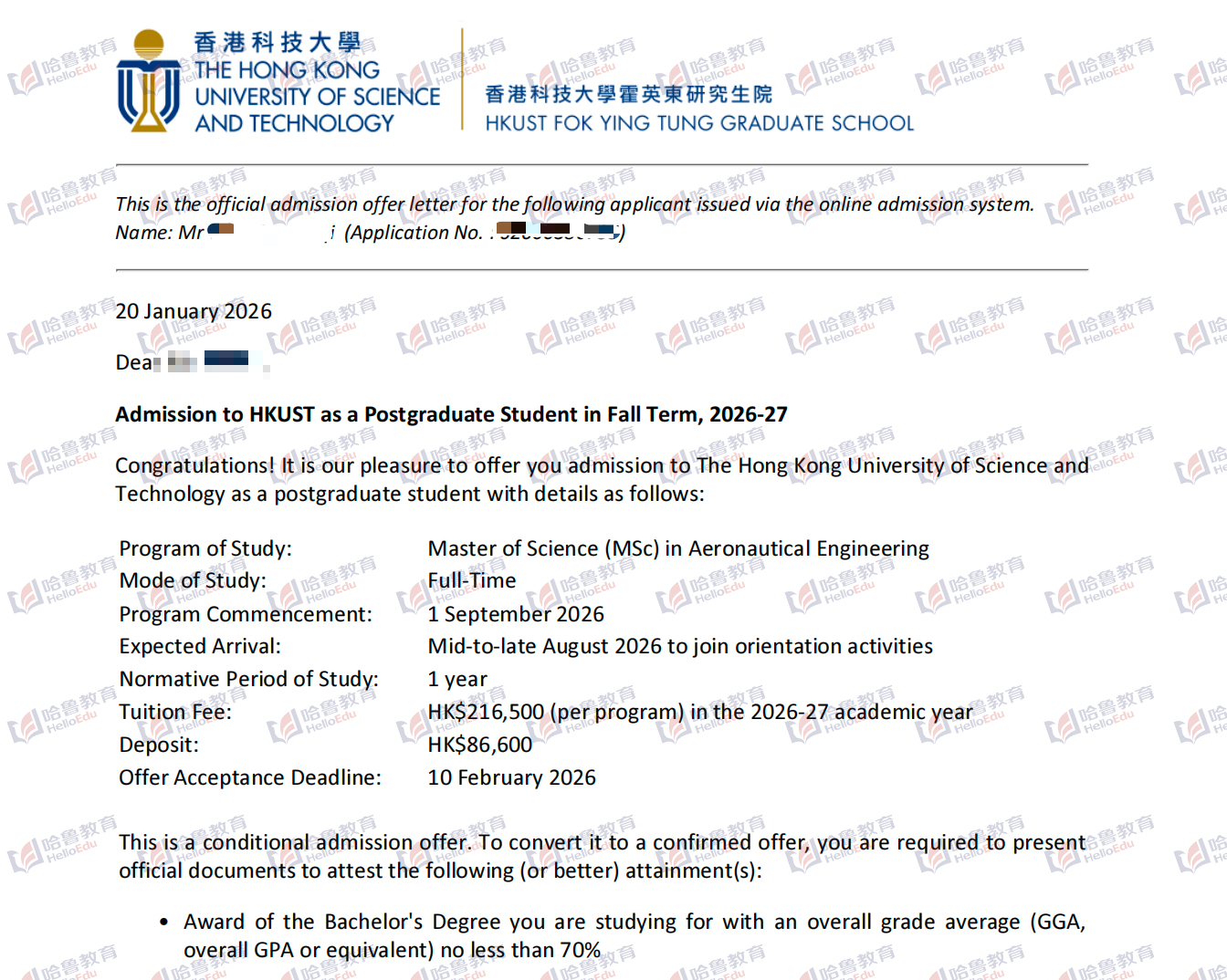 【哈鲁2026录取】GPA2.9+斩获香港科技大学航空工程硕士offer!