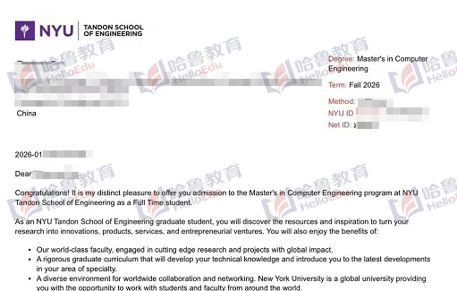 【哈鲁2026录取】GPA85+获纽约大学计算机工程硕士offer!