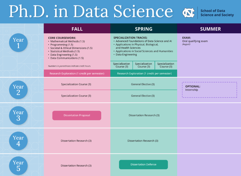 博士研究生将进入为期五年的研究型项目,核心课程包括数学、统计基础、编程、社会和伦理维度、沟通和数据工程。学生将轮换到不同的教授实验室,以了解前沿研究,然后在第一年与一位教授顾问配对,该顾问将指导学生的论文。到第二学期,学生必须从四个专业方向中选择一个。