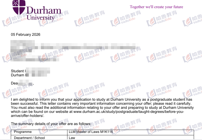 【哈鲁2026录取】杜伦大学法学硕士offer到!