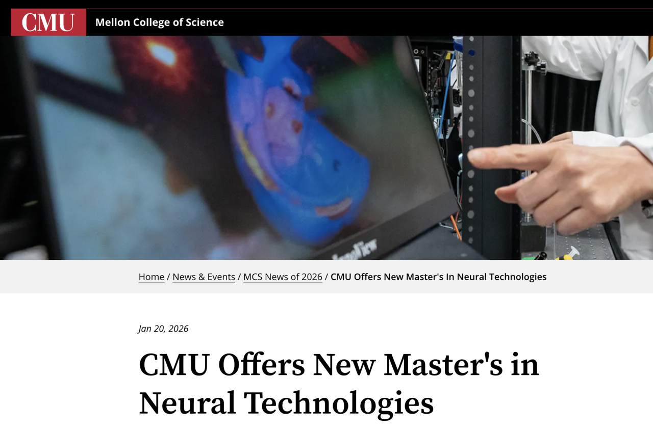 在今年1月末,卡内基梅隆大学官宣推出全新神经技术硕士(Masters in Neural Technologies,以下简称MINT),26fall为首届招生!该项目由CMU的神经科学研究所和生物医学工程系联合提供,将学生置于神经科学与工程和人工智能快速发展的前沿。