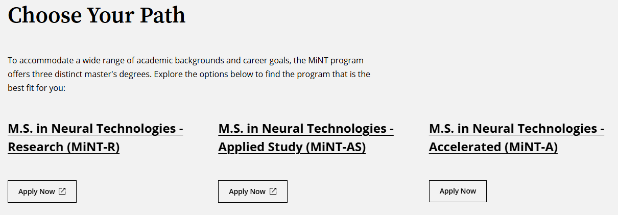 神经技术硕士研究项目(MiNT-R)旨在为希望在学术或行业中追求博士或研究密集型职业的学生设计。这个学位将为学生提供必要的高级知识和独立研究技能,以推进我们对脑功能和智能系统的理解。
