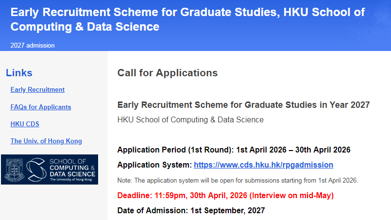 26fall申请季还没结束,27fall的提前批名额已经开抢?是的,您没看错!!!近日香港大学计算机与数据科学学院(以下简称HKU CDS)已官宣将于4月1日开放27fall硕博项目的提前批申请,并于4月30日截止,仅一个月时间!