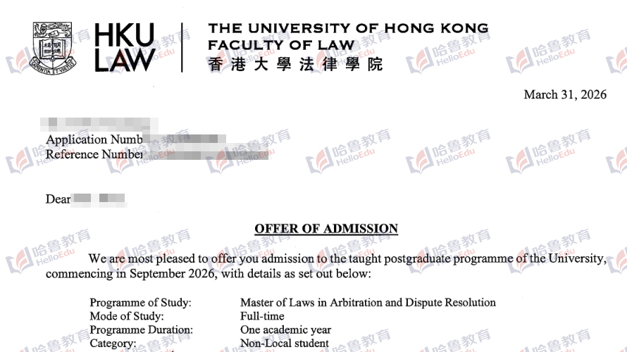 【哈鲁2026录取】GPA3.3+获香港大学法学硕士offer!