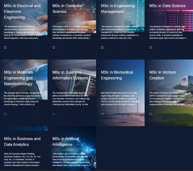 目前,该大学开设的硕士专业有:计算机科学、商务资讯系统、电机与电子工程学、生物医学工程、材料工程及纳米科技、工程管理学、数据科学、创新创业、商业及数据分析、人工智能硕士。