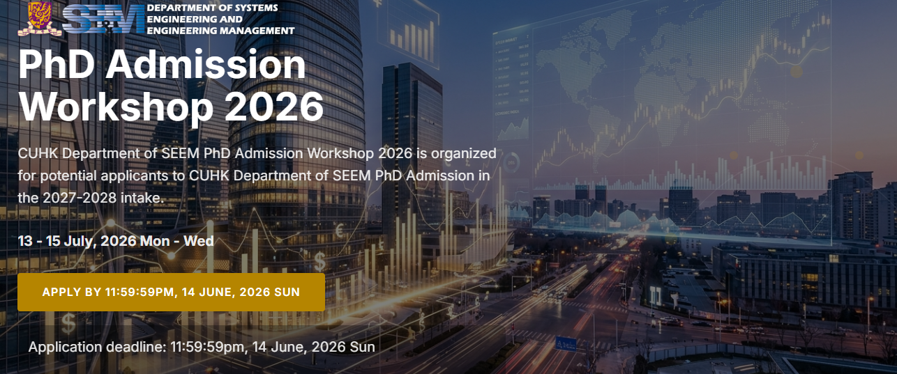 香港中文大学系统工程与工程管理系 2026年博士招生暑期Workshop现已开放申请,该Workshop为2027-2028年CUHK理工大学博士入学的潜在申请人举办的,截止时间为6月14日!