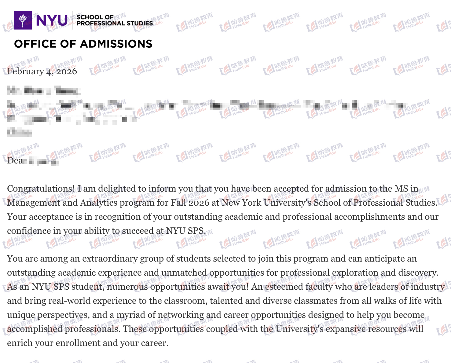 【哈鲁2026录取】GPA80获纽约大学管理与分析硕士offer!