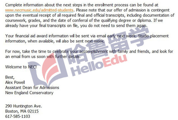 录取三:新英格兰音乐学院Bachelor of Music-Piano录取,学校也承诺会给到梁同学奖学金,奖学金,在一周后出。