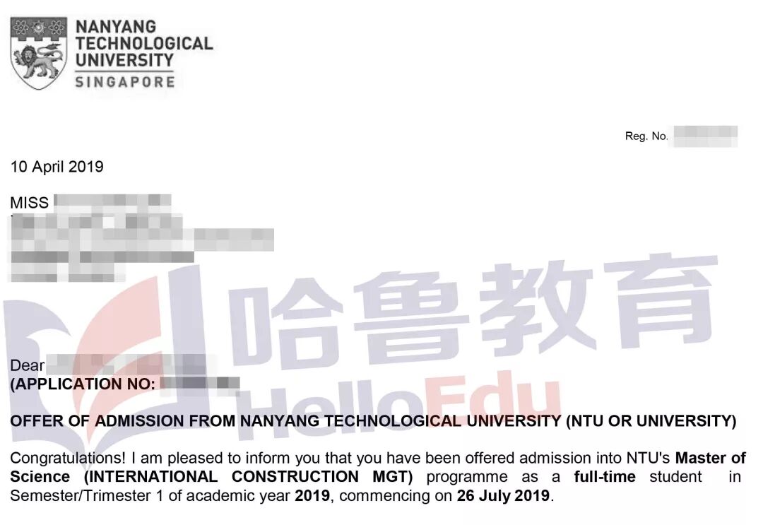 【哈鲁2019录取】QS排名第12的牛校录取!恭喜我们的哈鲁学员成功斩获南洋理工大学建筑管理硕士offer!