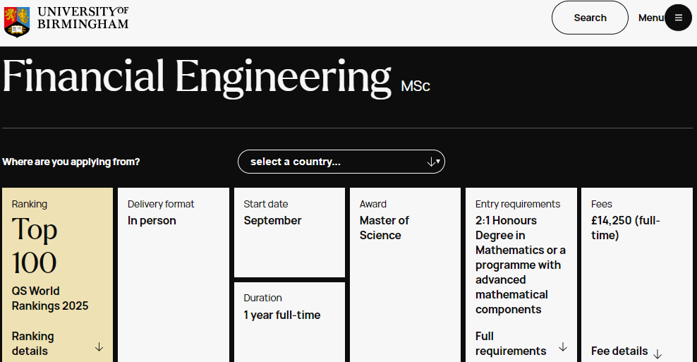 伯明翰大学金融工程硕士项目是一个为期一年的全日制授课硕士学位,开设在其工程学院的数学系下。该课程将为学生在金融服务行业的一系列职业机会做好准备。该课程将使学生具备必要的技能,不仅能在量化金融领域脱颖而出,还能在数据科学和其他重视数学基础的行业中也能脱颖而出。所以,如果你有兴趣从事这些领域的职业,这门课程可能是你的绝佳选择。