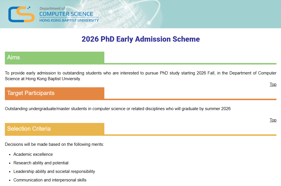 同学们注意啦!香港浸会大学提前批申请为有兴趣从2026年秋季开始在计算机科学系攻读博士学位的优秀学生提供提前录取。项目适合将于2026年夏季毕业的计算机科学或相关学科的优秀本科生/硕士生。
