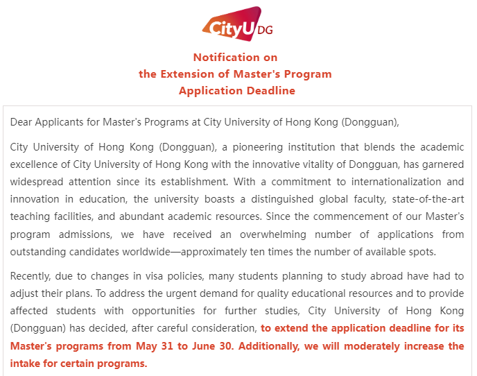 都6月了,还没拿到offer,现在申请25fall还来得及吗?答案是肯定的!近日,有不少学校重新开放或延期25fall申请工作!例如香港城市大学(东莞)7大硕士课程原计划于5月31日截止申请,现已官宣延长至6月30日,并适度扩大一些课程学额。