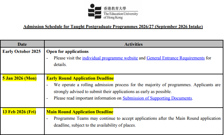 香港教育大学26fall提前开放申请!新增多个硕士专业!