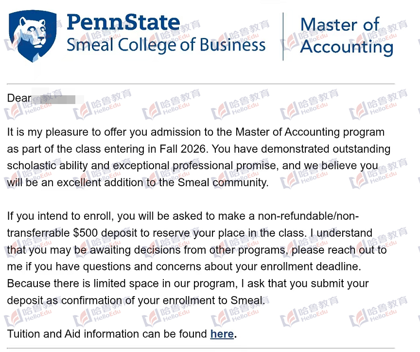 【哈鲁2026录取】宾夕法尼亚州立大学会计学硕士offer到!