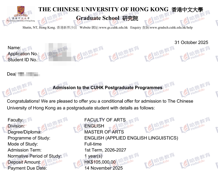 【哈鲁2026录取】双非背景获香港中文大学应用英语语言学硕士offer!