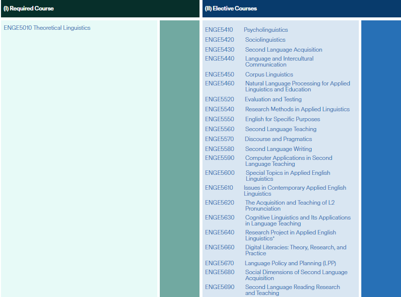 香港中文大学的英语(应用英语语言学)硕士课程是一个一年制(全日制)或两年制(兼读制)的研究生课程,是为那些接触过语言研究或英语语言学,并对这些领域有浓厚兴趣的人设计的。该项目提供广泛的应用语言学课程,使学生能够使用他们的语言学知识来达到现实世界的目的或解决现实世界的问题。本课程结束后,学生将详细探索应用语言学的基本研究领域,并能够将这些知识应用到实际语言中。凭借更高水平的批判性思维技能和应用语言学的专业知识,毕业生将获得更好的机会在教育、商业和大众传媒领域发展。在竞争激烈的就业市场中,毕业生用书面和口头英语进行有效交流的能力也成为他们的无价资产。