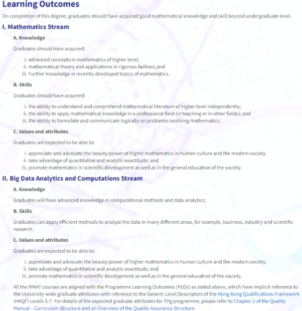 选择专攻数学方向的学生需完成数学编码MMAT5xxx的24个单元,其中最多可从MATH3XXX-4XXX或MATH5XXX-6XXX中选择3个单元;选择专攻大数据分析和计算方向的学生需要完成MMAT5XXX的24个单元,其中至少有18个单元选自MMAT5210、5230、5240、5250和53XX,最多可从MATH3XXX-4XXX或MATH5XXX-6XXX中选择3个单位。