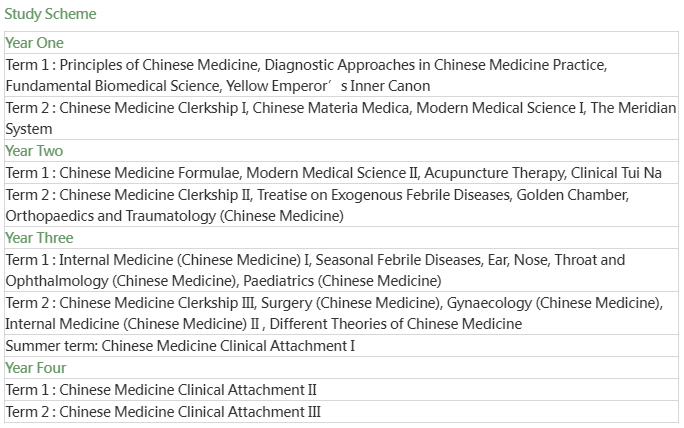 中医硕士是四年全日制课程,由临床前课程(3年)和临床课程(1年)组成。学生必须完成中医概念、中医专业和基础医学及生命科学的课程。学生随后将在内地的中医医院和/或香港的专科诊所接受高级临床培训(1年)。