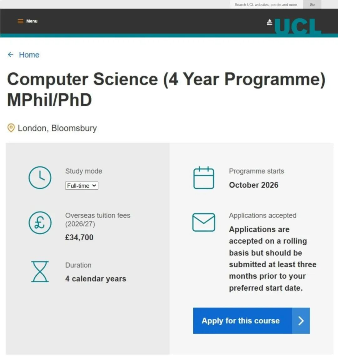 而UCL计算机科学博士、教育学博士等专业申请采用 Rolling Admission 即以滚动方式接受——将全年接受申请,不过至少要在入学前3个月提交申请。