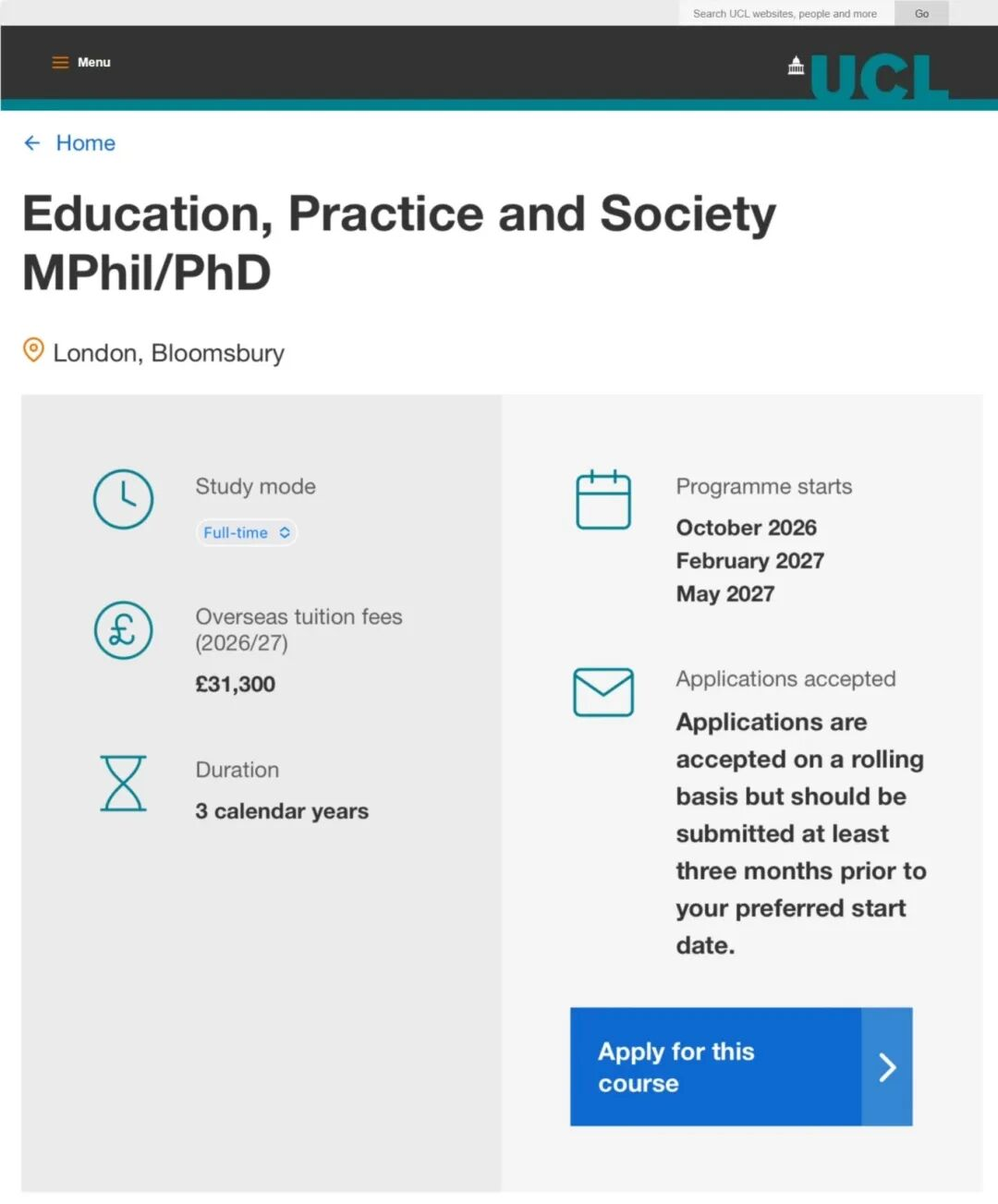 UCL大多数专业都为Rolling Admission,但也有采用Round Admission,例如临床、教育和健康心理学博士申请于2025年10月20日开始,2026年6月26日截止。