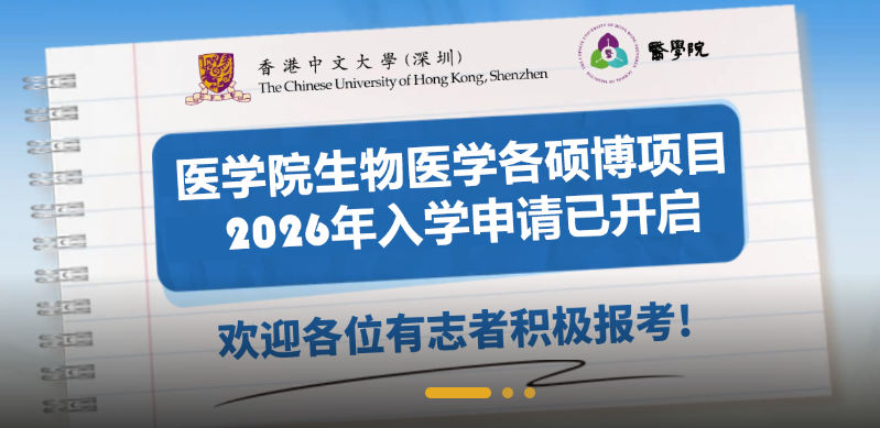 香港中文大学(深圳)医学院于2021年8月正式成立,五个研究型项目及一个授课型项目:生物科学哲学硕士-博士项目、生物医学工程哲学硕士-博士项目、生物信息学理学硕士项目、药理学哲学硕士-博士项目、计算生物与医学信息学哲学硕士-博士项目、流行病学和生物统计学哲学硕士-博士项目!此外,临床医学哲学硕士-博士项目正在筹备中(待更新再与同学们分享,敬请期待 )。