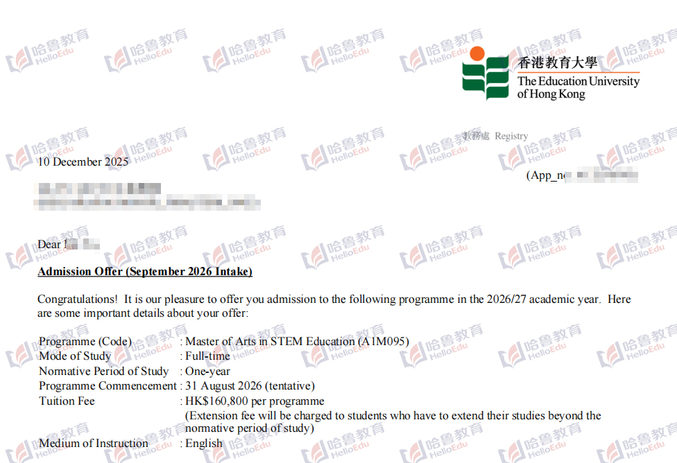 【哈鲁2026录取】GPA70+、无语言获香港教育大学STEM教育学硕士offer!