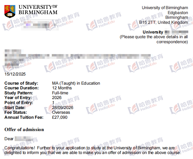 【哈鲁2026录取】民办双非无语言获伯明翰大学教育学硕士offer!