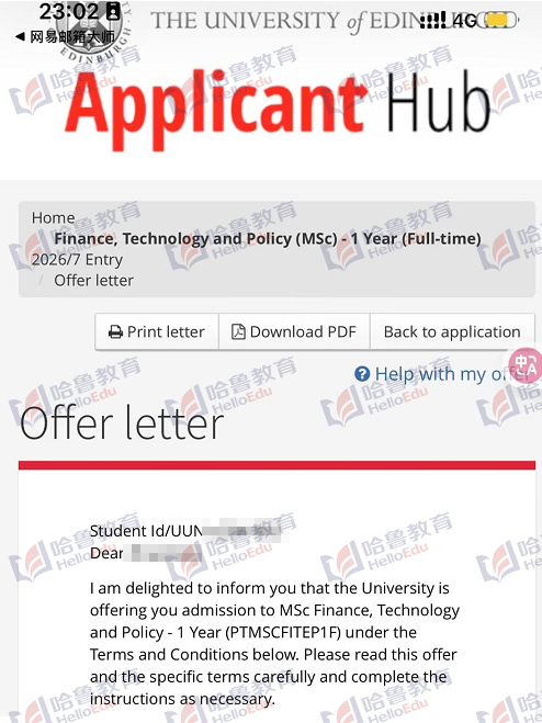 【哈鲁2026录取】GPA85+获爱丁堡大学金融、技术与政策硕士offer!