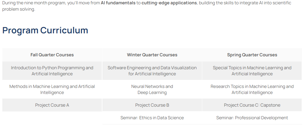 在九个月内,学生将从Python编程和数据处理进步到高级人工智能方法,如深度神经网络、大型语言模型和生成式人工智能。在这个过程中,学生将加强数学和统计学基础,掌握数据工程和可视化,并学习在科学背景下道德和有效地部署人工智能。通过动手项目,学生将把这些技能直接应用于所在领域的挑战,毕业时获得一个连接你的科学背景和人工智能专业知识的作品集。