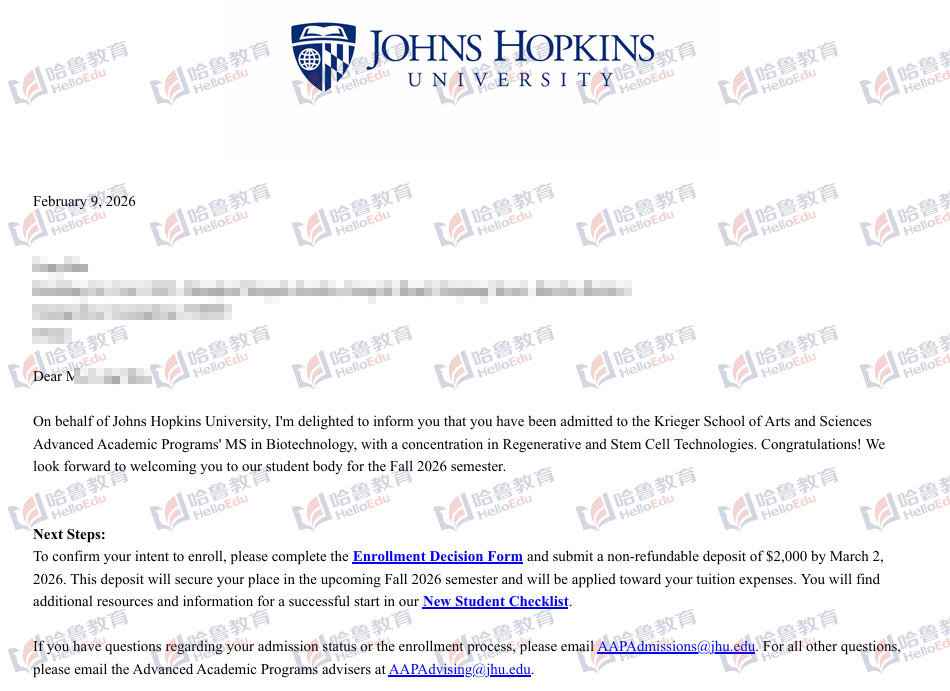 【哈鲁2026录取】厉害了!GPA80+约翰霍普金斯大学生物技术硕士offer!