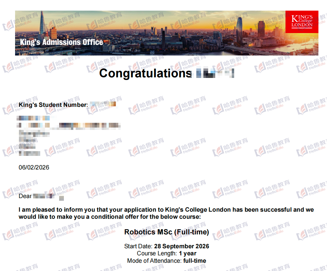 【哈鲁2026录取】GPA3.2+获伦敦国王学院机器人学硕士offer!