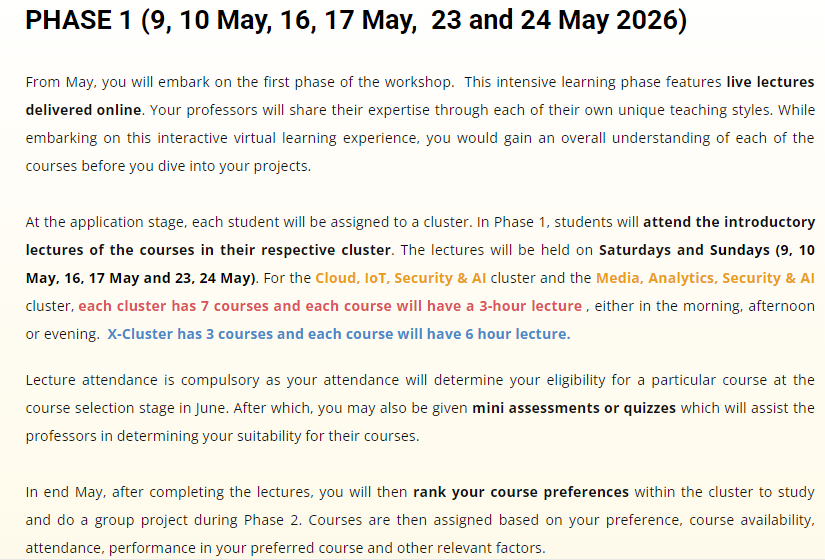 该阶段的特点是现场讲座在线交付。在申请阶段,每个学生将被分配到一个集群cluster,一共三个,分别是: