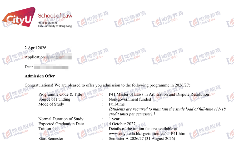 【哈鲁2026录取】再添一枚香港城市大学仲裁与争议解决法学硕士offer!